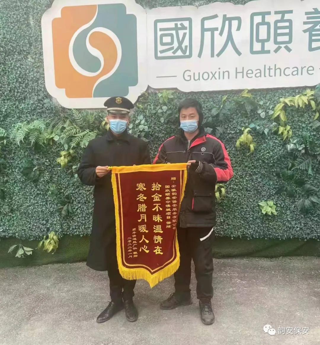 2022年1月6日下午,順豐快遞的快遞員趙廣仁興匆匆地趕到安徽韻安保安服務有限公司山金中澳城安保項目駐地,送來一面錦旗,錦旗上寫道:“拾金不昧溫情在,寒冬臘月暖人心”,對公司保安員徐炫急他人所急,想他人所想的拾金不昧舉動表示衷心的感謝。