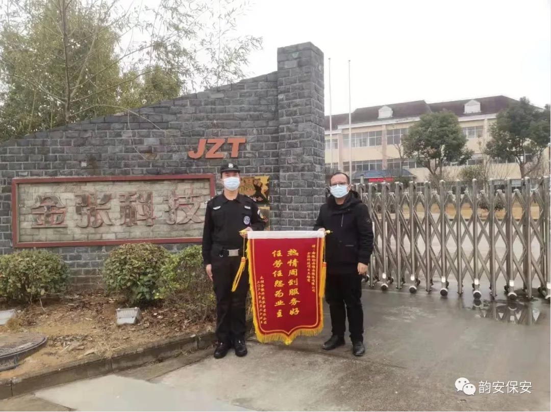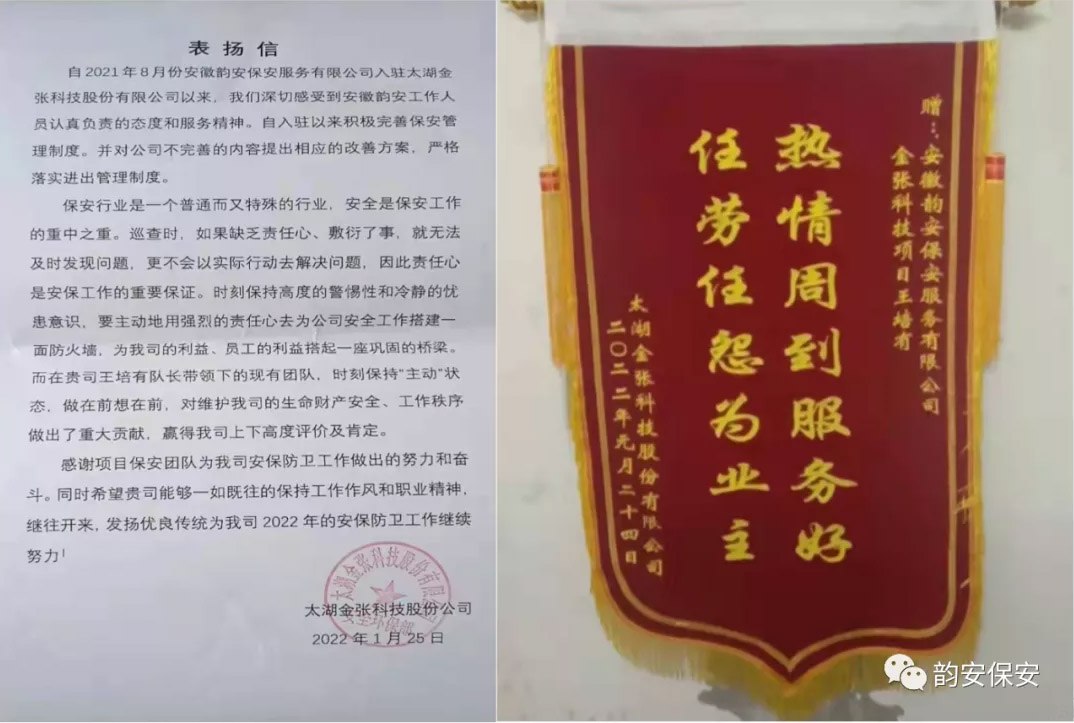 安徽韻安保安服務有限公司自承接太湖金張科技股份有限公司安保項目以來,公司領導高度重視,深入現場,組織人力,認真負責做好各項安保服務工作,及時有效地完成各項任務。為此,時值小年,客戶先后送來表揚信與錦旗,對韻安公司做好安保服務項目各項工作給予高度肯定與贊揚。